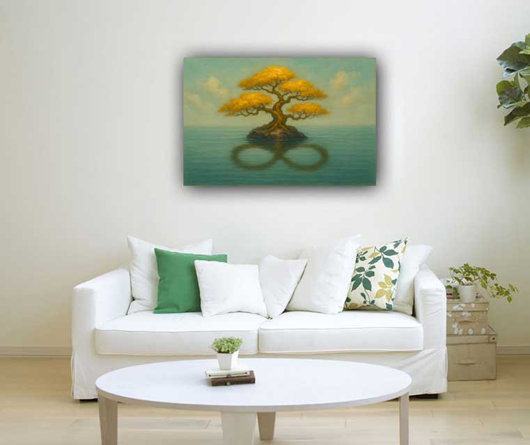 This serene painting of a golden money tree standing over calm water with a perfect reflection symbolizes uninterrupted money flow and balanced financial growth. The reflection doubles the energy of wealth, making it ideal for the north direction to activate income opportunities and career progress. The calm water enhances clarity and stability in financial decisions. As a vastu painting, it helps attract consistent income, new opportunities, and long-term financial balance. Perfect as wall art, canvas wall art, or modern canvas prints for homes and offices seeking prosperity with peace.