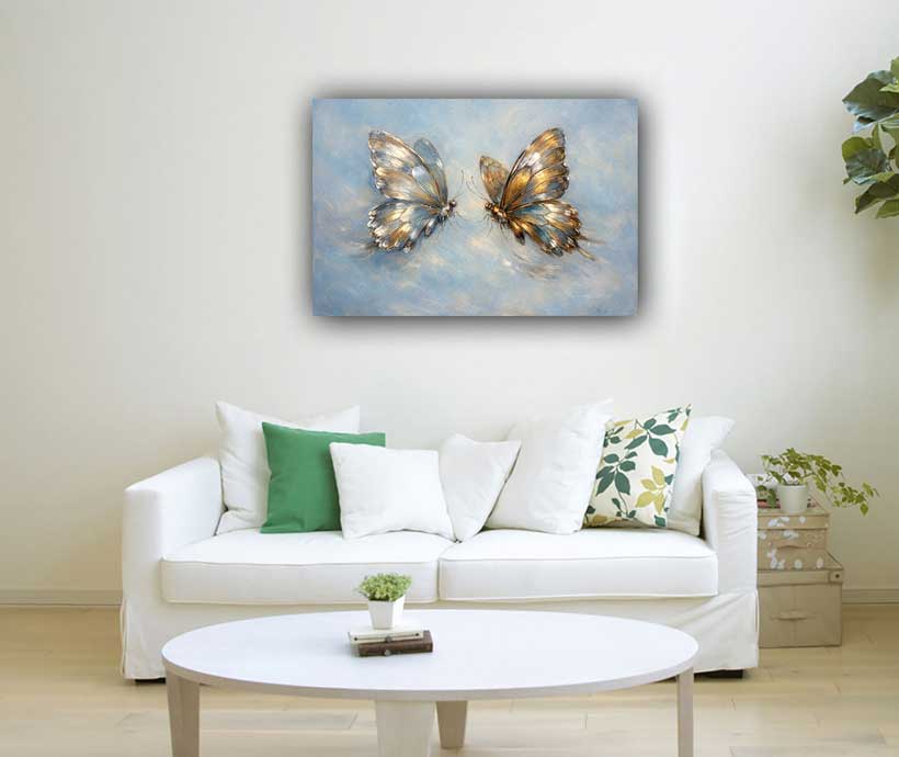 This delicate artwork on canvas featuring butterflies in pairs symbolizes transformation, love, and communication. These vastu paintings are ideal for enhancing relationships and harmony in North-West.