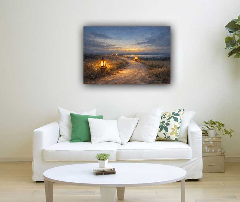 This calming artwork on canvas shows a softly lit path at dusk, symbolizing guidance, clarity, and steady progress. Ideal for personal and professional spaces, this modern canvas print enhances confidence and direction. As a vastu painting, it supports clarity and forward movement.