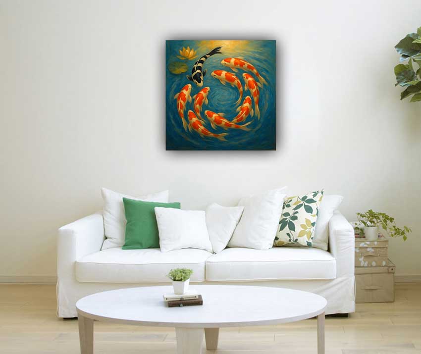 This 8+1 Koi Fish Painting is designed for placement in the North direction to enhance career growth, financial opportunities, and positive energy flow. Featuring eight golden koi fish symbolizing wealth and abundance, along with one black koi for protection from negativity, this artwork brings balance and prosperity into your space. Ideal for homes, offices, or business settings, the painting aligns with the Water element of the North, activating flow and success. Crafted on premium canvas with vibrant, fade-resistant colors, it’s a powerful blend of aesthetic beauty and Vastu significance.