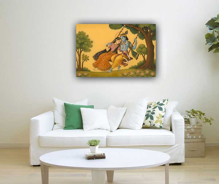 Radha Krishna on Swing Painting captures divine romance and happiness. Perfect for home décor and spiritual spaces, it brings harmony, love, and positive energy to your surroundings.