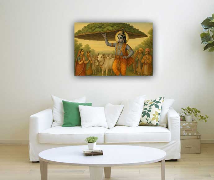 Krishna Painting with Govardhan depicts Lord Krishna lifting the sacred mountain to protect his devotees. Ideal for Vastu décor, it brings courage, divine grace, and positive energy to your home.