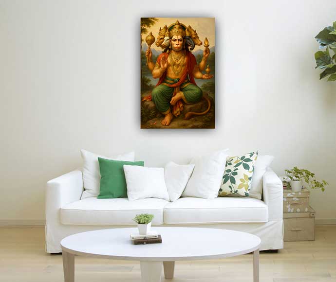 Panchmukhi Hanuman painting symbolizes strength, protection, and divine power. With five faces representing different deities, it guards against negative energies and brings courage, focus, and spiritual growth. Ideal for home or office, it inspires devotion and inner strength.