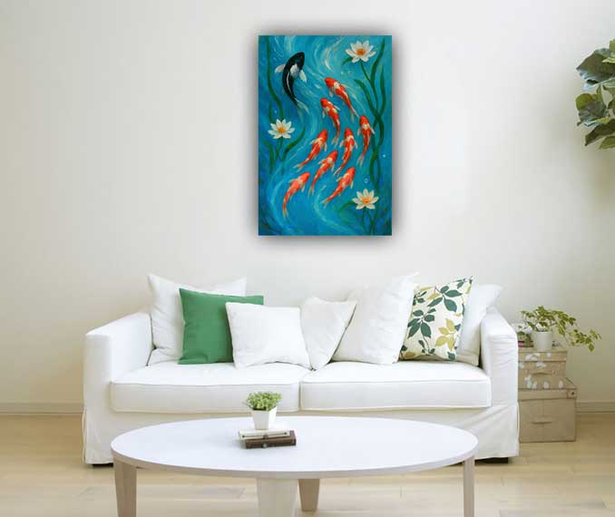 A modern canvas print that features 9 koi fish gliding upward in calming blue tones. According to Vastu, this placement in the North direction boosts career growth, business flow, and clarity. Suitable for homes and offices in urban settings like Mumbai, Delhi, Pune, Bangalore, USA, Noida, and Gurugram, it blends aesthetics with ancient wisdom.