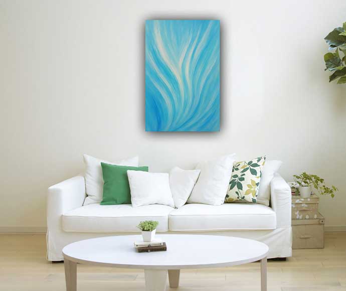 Modern abstract waterfall painting for the North wall as per Vastu. Promotes flow, clarity, and financial success. Canvas wall art in soothing blue tones.