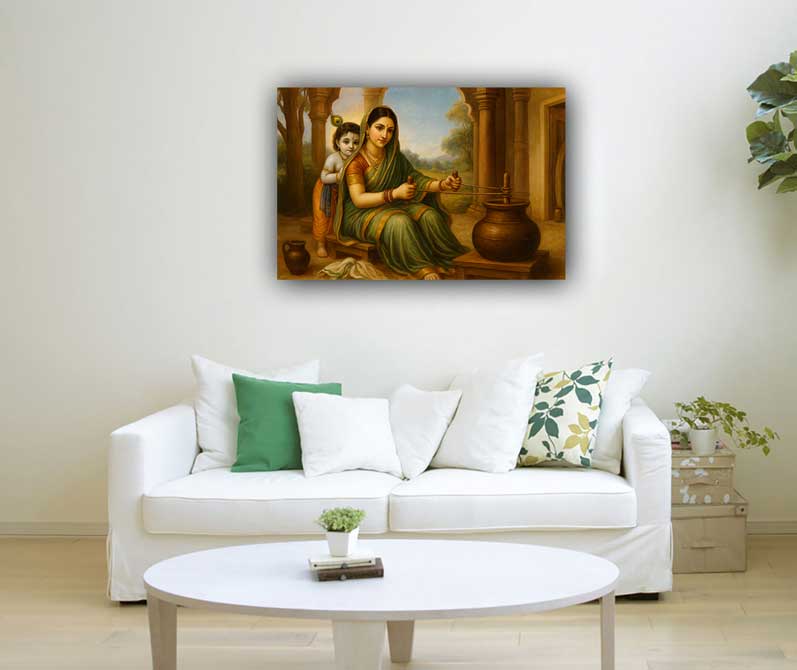 Beautiful painting captures the divine bond between Maa Yashoda and little Krishna, as she churns butter while He watches with innocent joy. The scene reflects motherly love, devotion, and spiritual warmth. Churning butter symbolizes patience, nurturing, and purity—just like a mother shaping her child. A reminder that divinity lies in simple, loving acts, this artwork brings a sense of peace, love, and blessings to any space.