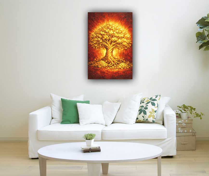Golden Tree of Life Wall Art – Radiating Abundance and Eternal Good Fortune is a symbolic artwork representing prosperity, growth, and the interconnected flow of life energy. The Tree of Life is widely recognized as a powerful symbol of strength, abundance, and continuous prosperity.The spreading branches and deeply rooted trunk represent stability, growth, and the expansion of opportunities. Rendered in glowing golden tones with warm radiant highlights, the tree symbolizes flourishing wealth, positive transformation, and long-lasting success. The Golden Tree of Life symbolizes: Continuous growth and prosperity Stability and strong foundations for success Abundance flowing into all areas of life Harmony, balance, and good fortune