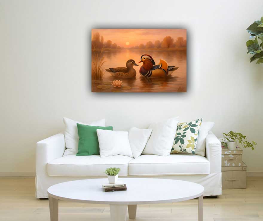 This Duck Painting is a Vastu-inspired artwork meant to bring stability, family bonding, and harmony when placed in the Southwest direction. The pair of ducks symbolizes trust, companionship, and grounding energy, ideal for strengthening relationships. Crafted on premium canvas with high-definition printing, it enhances your interiors while aligning your space with positive vibrations. Suitable for living rooms, bedrooms, or offices, this wall art blends tradition with modern décor.