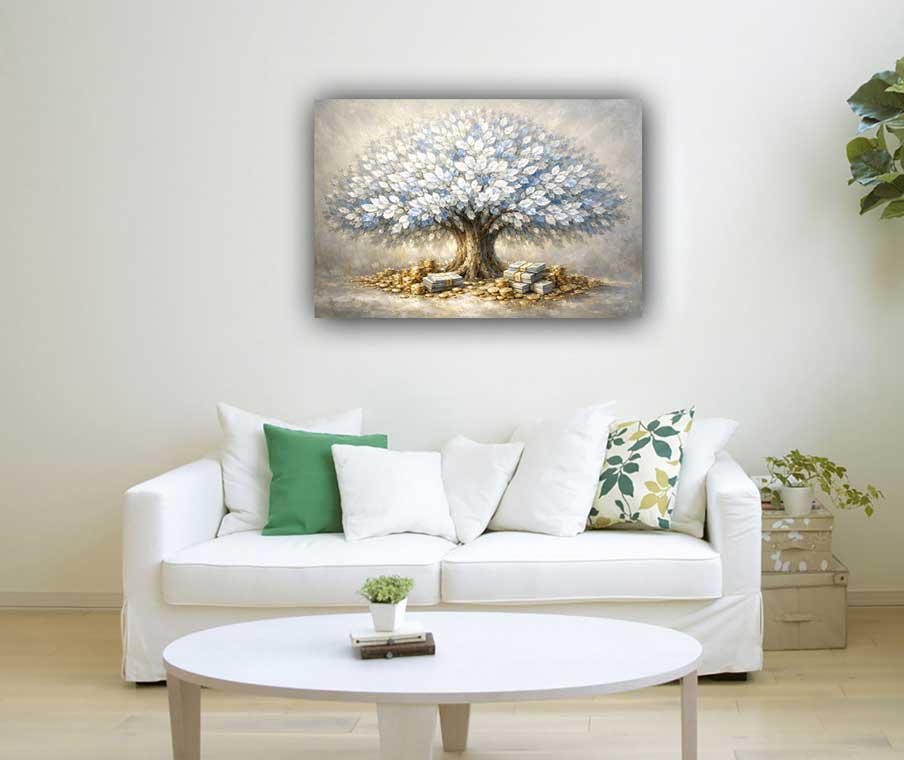 This luxurious painting of a flourishing money tree surrounded by gold coins and bundles of cash symbolizes powerful wealth growth, financial expansion, and abundance. The strong tree trunk represents stability and long-term success, while the radiant leaves reflect continuous income and opportunities. The presence of gold coins and currency enhances the energy of prosperity and material success. Ideal for offices, living rooms, or business environments, this artwork inspires confidence and wealth creation. As a vastu painting, it helps attract financial abundance, support steady growth, and maintain prosperity. Perfect as wall art, canvas wall art, or modern canvas prints, it adds richness and a premium feel to your décor.
