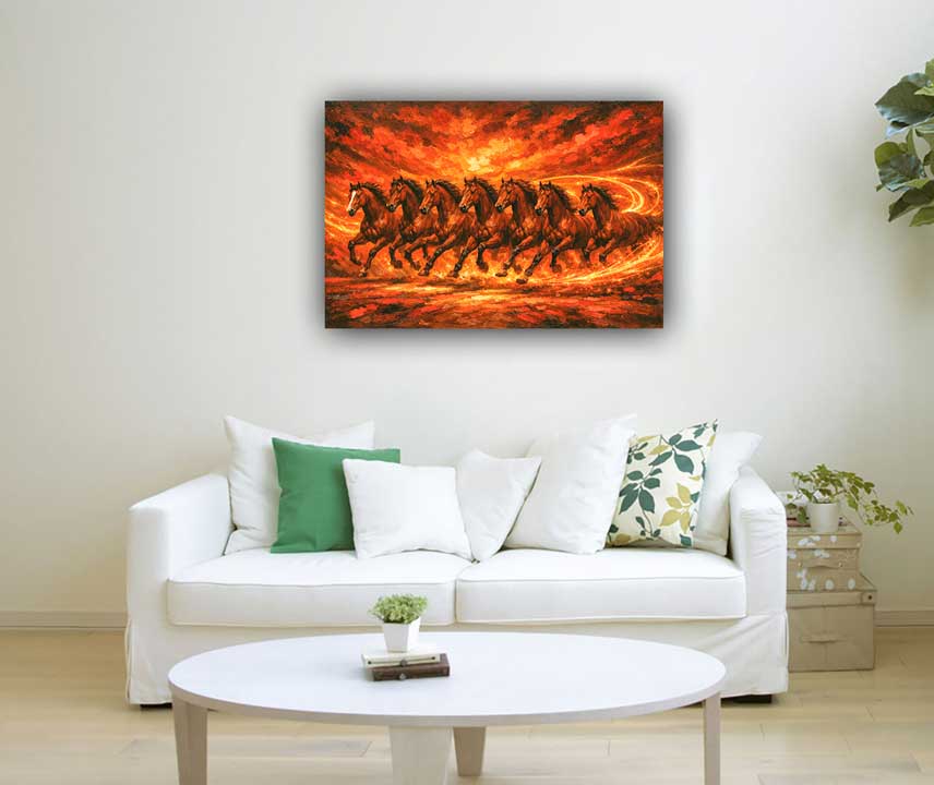 This vibrant painting showcases seven energetic horses running through fiery orange and red tones, symbolizing active income generation, profit growth, and financial energy. The South-East direction activates wealth-related energies, while the fire element enhances ambition, action, and results. The strong forward motion of the horses represents continuous cash flow and business success. Perfect for commercial spaces, offices, and trading environments to boost financial performance.