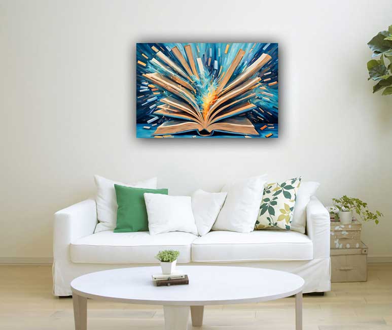 Enhance your space with this vibrant colorful book explosion artwork, designed for the Northwest to attract support, assistance, and mentorship from influential people. Perfect for fostering personal growth and guidance, this piece symbolizes the power of knowledge and wisdom.
