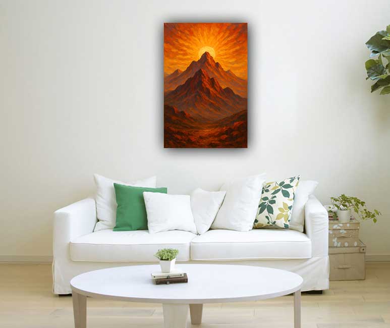 Evoke the power of the mountains and elevate your public image with this bold mountain wall painting. As per Vastu, placing this artwork on the South wall channels energy that enhances your name, reputation, and societal status.
