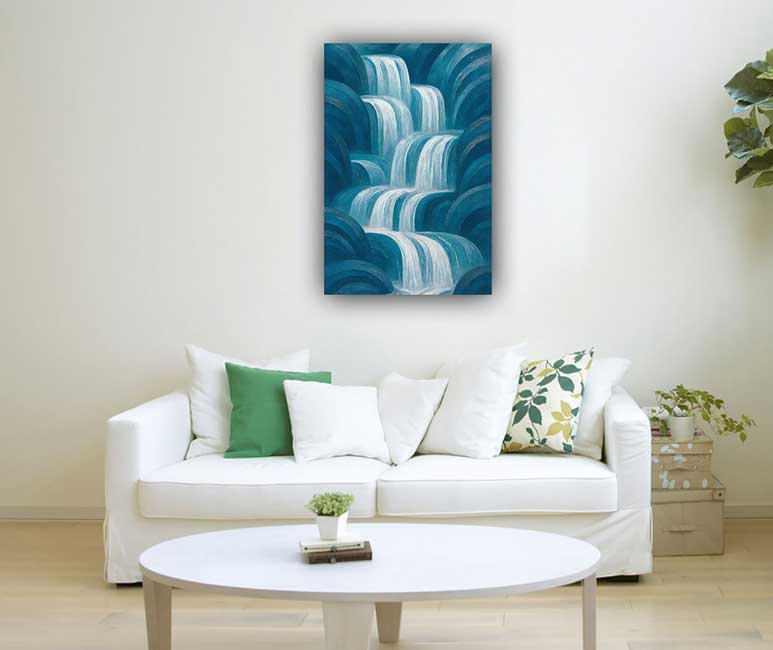 Modern abstract waterfall painting for the North wall as per Vastu. Promotes flow, clarity, and financial success. Canvas wall art in soothing blue tones.