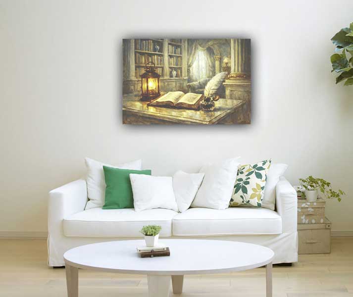 Library with Open Book, Lantern, Ink and Quill Vastu Painting for Northeast is a symbolic wall art that enhances wisdom, focus, and clarity. Ideal canvas wall art and modern canvas prints for study rooms and offices aligned with Vastu principles.For more options,visit : https://artfactory.in/category/Vastu-Feng-Shui/Learning-Symbols