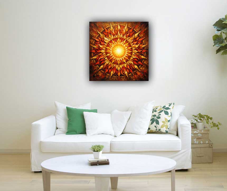 Golden Sun Mandala Wall Art – Radiant Fire Energy Symbol of Wealth and Prosperity is a striking abstract artwork inspired by the powerful symbolism of the sun. The glowing central sun represents life force, success, and expanding prosperity, while the surrounding flame-like petals radiate energy and abundance.The layered circular mandala composition reflects harmony, balance, and the continuous expansion of wealth and opportunities. Rich tones of molten gold, fiery orange, crimson, and copper create a dynamic visual impact that energizes any interior space.