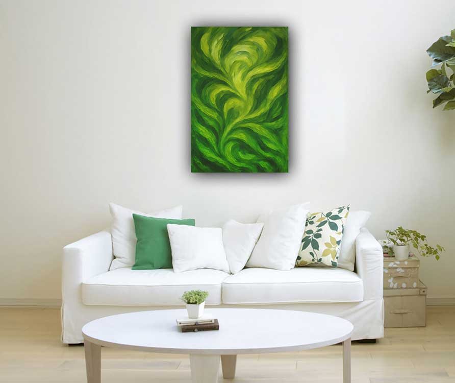 A vibrant green abstract canvas painting symbolizing vitality, natural growth, and the harmonious flow of positive energy. For more options, visit :https://artfactory.in/category/Vastu-Feng-Shui/Abstract