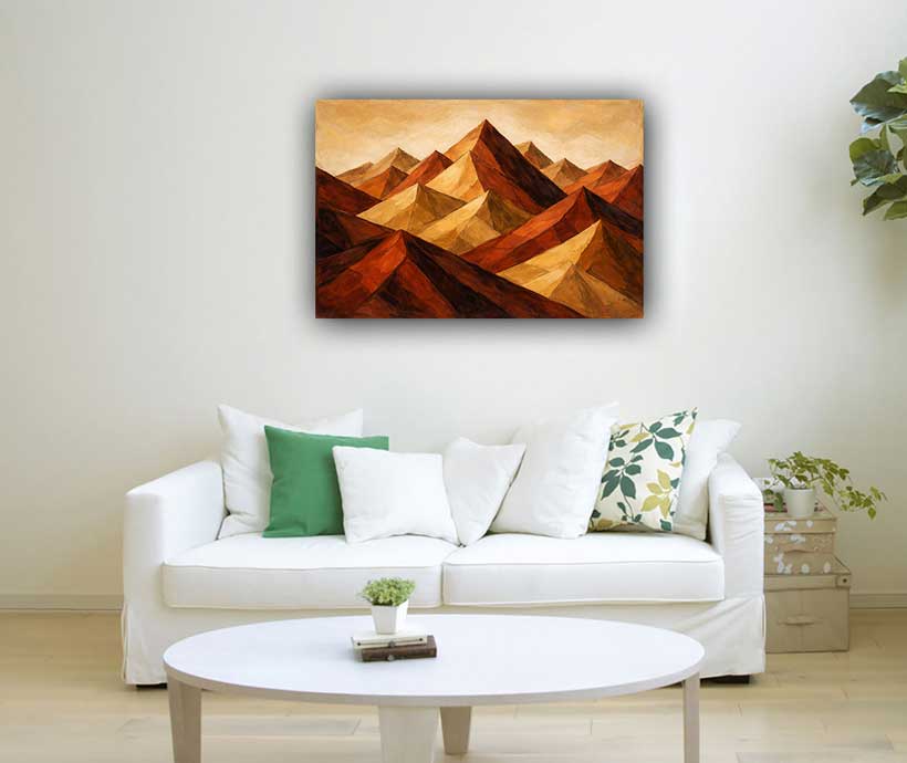 This bold Abstract Geometric mountain peaks painting symbolizes strength, resilience, and a deeply grounded presence. The sharp, structured peaks represent determination and stability, while the layered composition reflects growth through challenges. The warm earthy tones create a balanced and powerful visual, ideal for spaces that seek focus and strength. As a vastu-inspired artwork, it enhances stability, supports clarity in decisions, and brings grounded, positive energy into your surroundings.