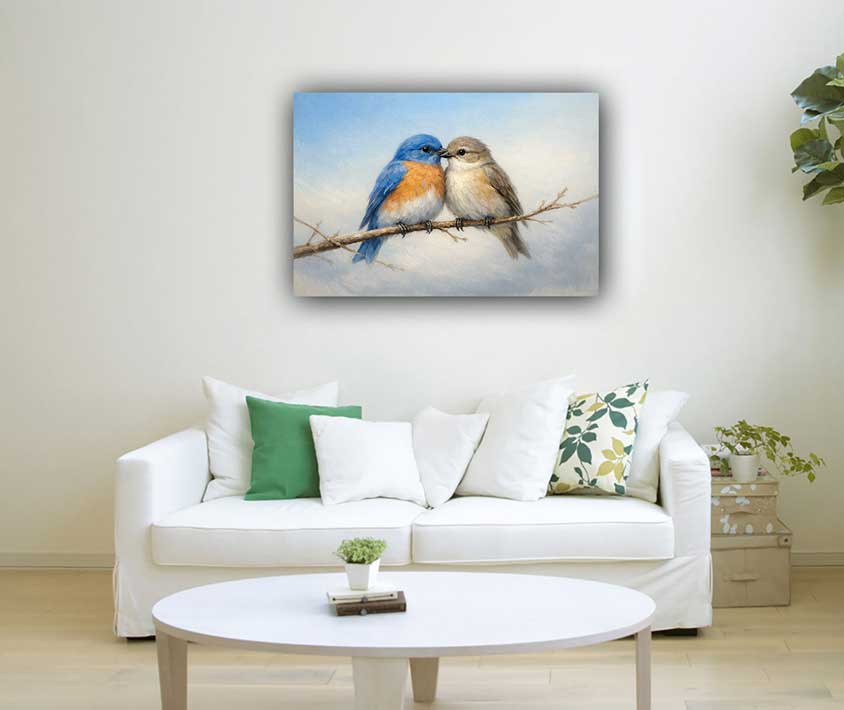 This charming artwork on canvas features birds resting together on a branch, symbolizing harmony, companionship, and stable relationships. Perfect for living spaces and offices, this modern canvas print enhances peaceful communication and long-lasting connections. As a vastu painting, it supports social bonding and emotional stability, especially in the North-West direction.
