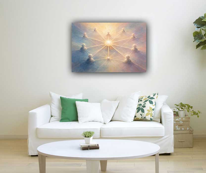 This contemporary artwork on canvas features geometric patterns symbolizing digital networks and modern connectivity. Ideal for corporate and tech spaces, this modern canvas print enhances innovation and collaboration. As a vastu painting, it activates networking and communication energy.