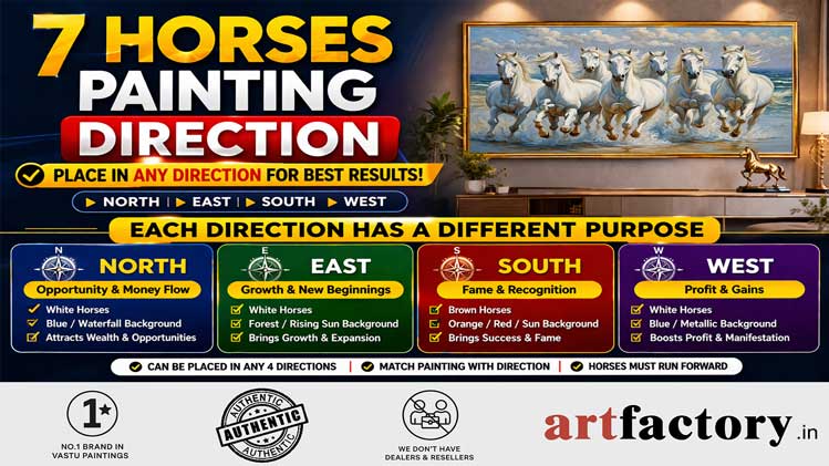 A 7 horses painting can be placed in any of the four directions. The key is to align the painting’s colors, background, and energy with the purpose of that direction—such as money, growth, fame, or profits.