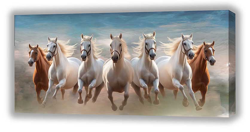 The 7 horse picture holds deep symbolic meaning, primarily rooted in ancient Indian art and mythology. The seven horses symbolize the seven elements that drive life forward, embodying qualities like intellect, ego, senses, and mind. It is also associated with the seven planets in Vedic astrology, signifying balance, energy, and spiritual progression. The image represents success, prosperity, and the harmonious alignment of various aspects in one's journey through life.