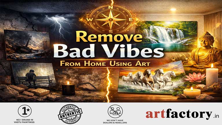 To remove bad vibes from your home using art, place positive and meaningful paintings according to Vastu directions. Use waterfall paintings in the North for opportunities, mountain paintings in the South-West for stability, and bright or fire-themed art in the South for fame and recognition. Avoid dark or negative imagery.
