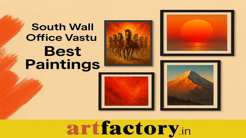 The South wall in an office represents Fame, Recognition, Success, and Authority. The best Vastu paintings for this direction include Seven Horses, Rising Sun, Mountains, Abstract Red-Orange Art, and Fire Element Paintings. These artworks strengthen professional growth, leadership energy, and visibility in the workplace.