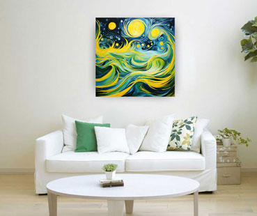 Abstract paintings with fluid and flowing patterns, especially in predominant blue and green tones, are excellent choices for enhancing the energy in your career space according to vastu principles. These colors symbolize tranquility, growth, and harmony, creating a conducive environment for productivity and success. The fluid patterns evoke a sense of movement and dynamism, reflecting the ever-evolving nature of your career.
