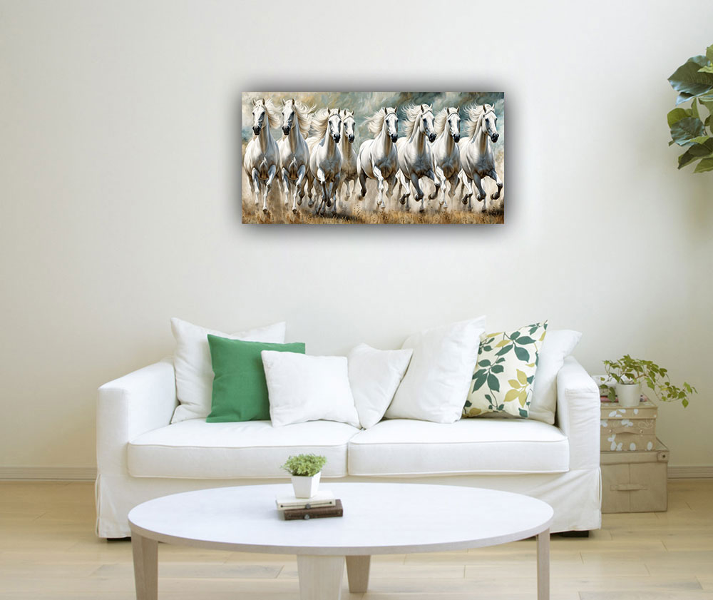 The captivating 8 horses painting depicts a scene of power, movement, and grace as eight majestic horses gallop together in unison. In the realm of Feng Shui, each horse symbolizes key attributes essential for achieving fame, recognition, and success. These attributes include strength, perseverance, determination, and unity.