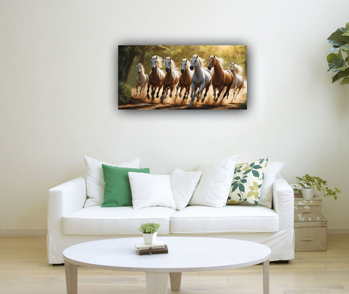 The painting features seven majestic horses galloping together, symbolizing a powerful and harmonious energy flow that propels one towards fame, recognition, and success. The south direction is associated with fame, recognition, and success. Placing the painting in the south area of a room or space aligns with Vastu principles, as it harnesses the positive energy associated with these attributes.