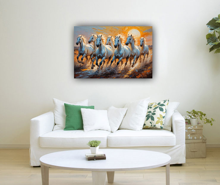 Step into a realm where tradition meets contemporary flair with our extraordinary Seven Horse Painting meticulously designed to harmonize with Vastu principles while infusing modern interiors with a burst of energy and sophistication. This unique artwork transcends the ordinary, boasting a mesmerizing amalgamation of symbolism, color, and artistic expression.