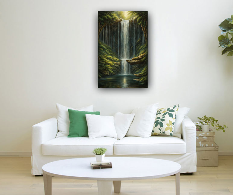 In Vastu Shastra, an ancient Indian architectural philosophy, waterfalls symbolize abundance, prosperity, and the flow of positive energy. Placing a waterfall painting in the north or northeast direction of a home or office is believed to attract wealth and financial success. The flowing water in the painting represents the constant flow of opportunities and resources into one's life.