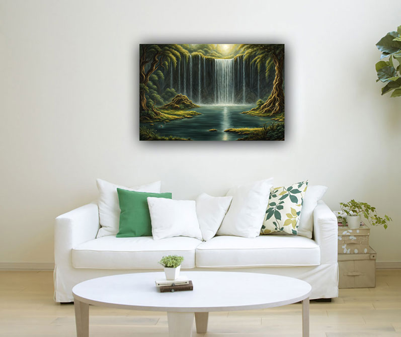 In Vastu Shastra, an ancient Indian architectural philosophy, waterfalls symbolize abundance, prosperity, and the flow of positive energy. Placing a waterfall painting in the north or northeast direction of a home or office is believed to attract wealth and financial success. The flowing water in the painting represents the constant flow of opportunities and resources into one's life.