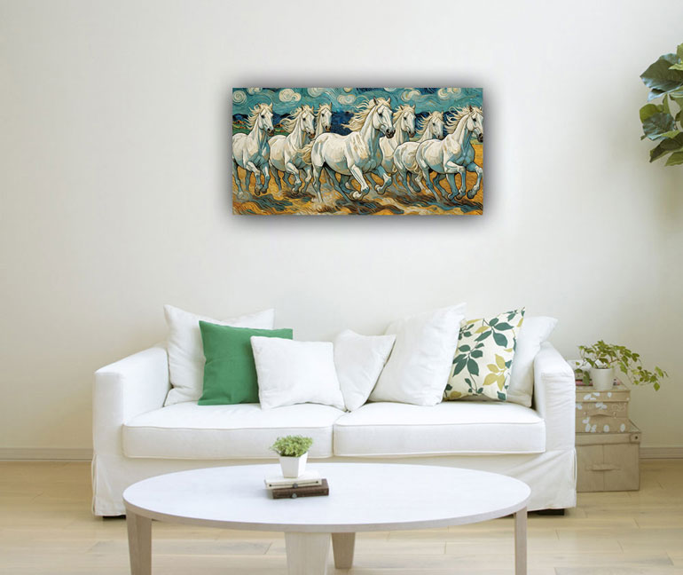 The painting features seven majestic horses galloping together, symbolizing a powerful and harmonious energy flow that propels one towards fame, recognition, and success. The south direction is associated with fame, recognition, and success. Placing the painting in the south area of a room or space aligns with Vastu principles, as it harnesses the positive energy associated with these attributes.