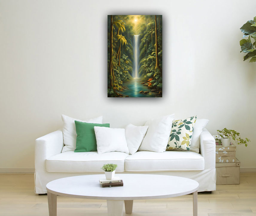 In Vastu Shastra, an ancient Indian architectural philosophy, waterfalls symbolize abundance, prosperity, and the flow of positive energy. Placing a waterfall painting in the north or northeast direction of a home or office is believed to attract wealth and financial success. The flowing water in the painting represents the constant flow of opportunities and resources into one's life.