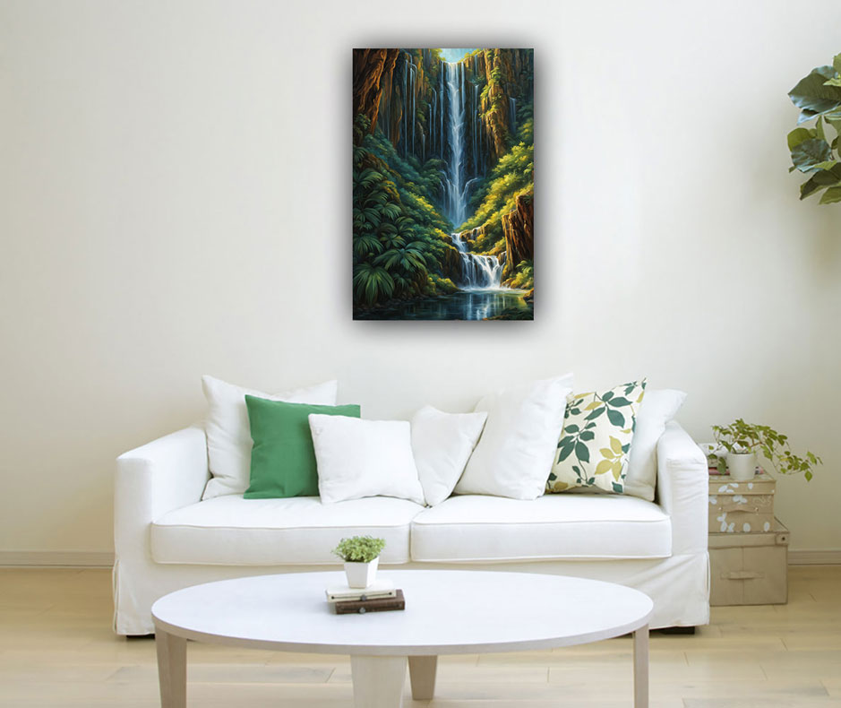 In Vastu Shastra, an ancient Indian architectural philosophy, waterfalls symbolize abundance, prosperity, and the flow of positive energy. Placing a waterfall painting in the north or northeast direction of a home or office is believed to attract wealth and financial success. The flowing water in the painting represents the constant flow of opportunities and resources into one's life.