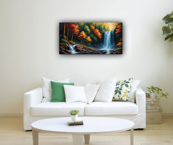 In Vastu Shastra, an ancient Indian architectural philosophy, waterfalls symbolize abundance, prosperity, and the flow of positive energy. Placing a waterfall painting in the north or northeast direction of a home or office is believed to attract wealth and financial success. The flowing water in the painting represents the constant flow of opportunities and resources into one's life.