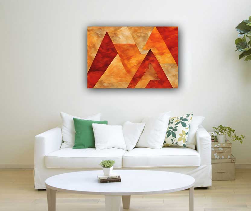 Experience the vibrant essence of Leo through abstract art adorned with striking red and orange hues, fashioned into dynamic geometric forms. Dive into a realm of passion and strength, where bold triangular shapes and powerful pyramids reflect the fiery spirit of the lion-hearted. Elevate your space with art that captures the essence of Leo's passionate energy.