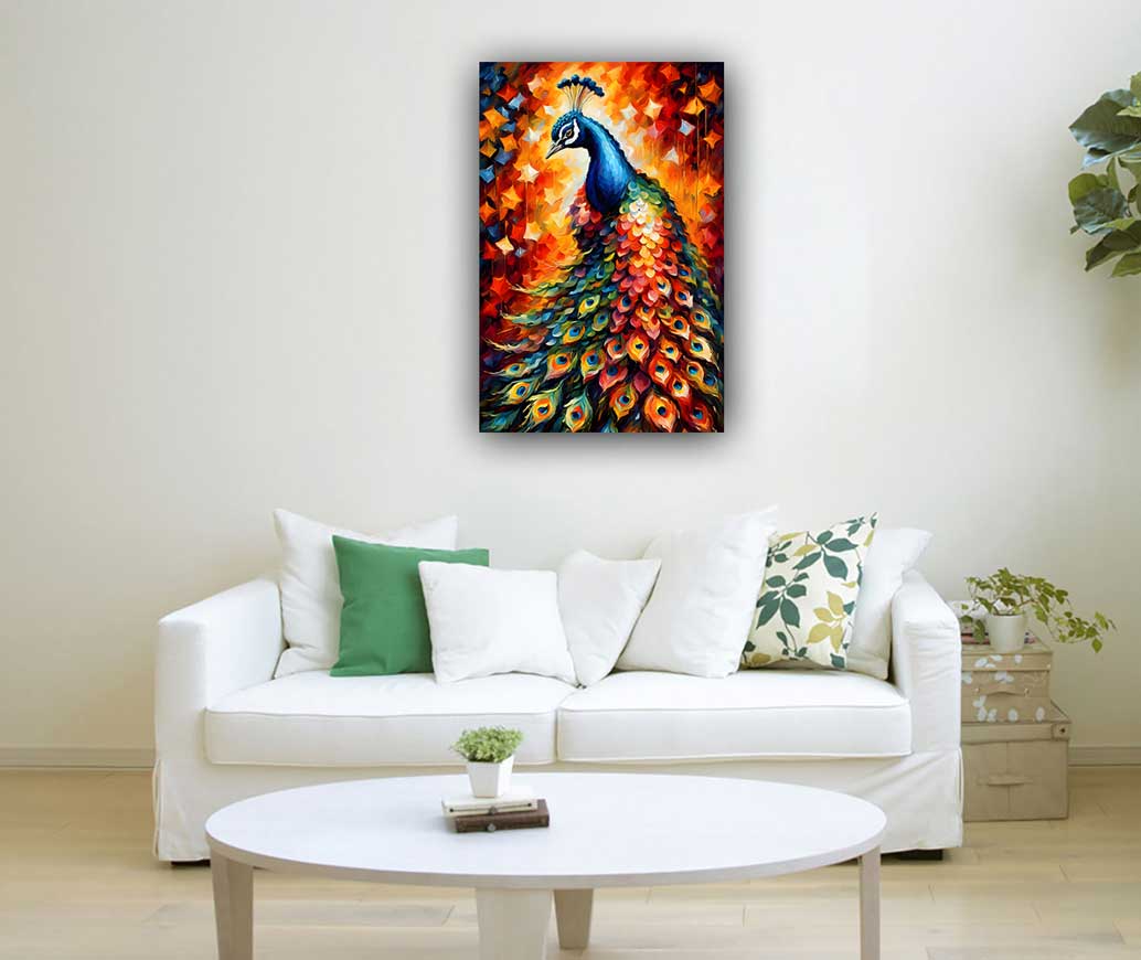 Peacock paintings hold significant importance in Vastu and Feng Shui. In Vastu, a peacock painting is believed to attract positive energy, bringing prosperity, harmony, and peace to the home. The vibrant colors and regal presence of the peacock symbolize beauty and grace, enhancing the aesthetic appeal and uplifting the mood. In Feng Shui, the peacock represents dignity, love, and prosperity. Placing a peacock painting in the living room or entrance can invite auspicious energy, fostering a balanced and harmonious environment.