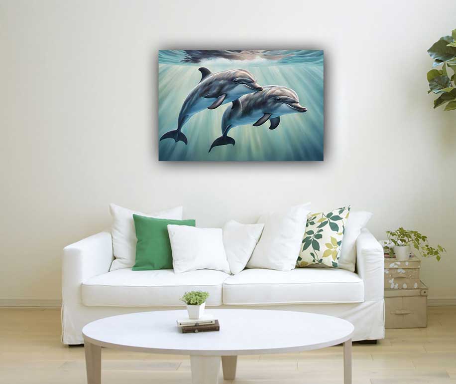 Connection with Water Element: Water is a fundamental element in Feng Shui associated with flow, abundance, and purification. Dolphins, as creatures of the sea, embody the vitality and movement of water. Pairing dolphin paintings with water-themed decor or placing them in areas representing the water element (such as the north or east sectors of a space) enhances the flow of positive energy and attracts prosperity.