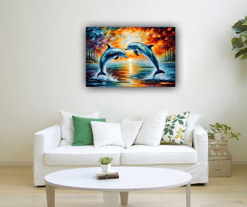 Connection with Water Element: Water is a fundamental element in Feng Shui associated with flow, abundance, and purification. Dolphins, as creatures of the sea, embody the vitality and movement of water. Pairing dolphin paintings with water-themed decor or placing them in areas representing the water element (such as the north or east sectors of a space) enhances the flow of positive energy and attracts prosperity.