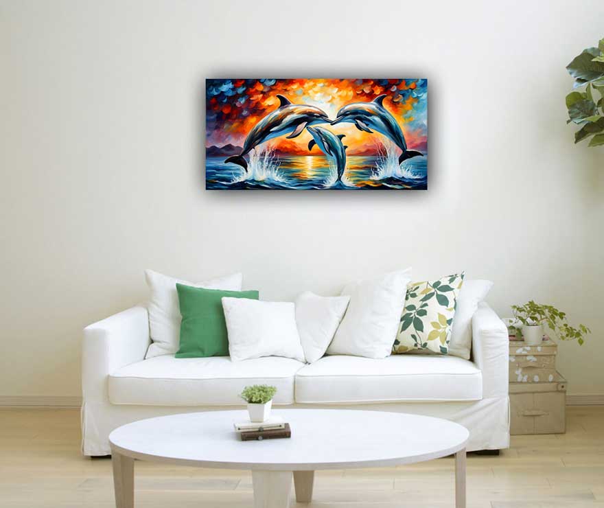 Connection with Water Element: Water is a fundamental element in Feng Shui associated with flow, abundance, and purification. Dolphins, as creatures of the sea, embody the vitality and movement of water. Pairing dolphin paintings with water-themed decor or placing them in areas representing the water element (such as the north or east sectors of a space) enhances the flow of positive energy and attracts prosperity.