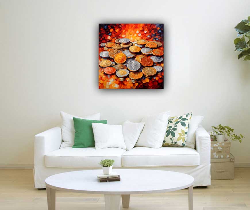 Placing this coin-themed painting in the South East corner of your home or office aligns with Vastu principles, optimizing financial opportunities and supporting monetary growth. This visual reminder of wealth helps to activate the energy of the South East, ensuring that financial resources remain abundant and accessible. Explore beautiful collection of Symbol of Abundance Click Here