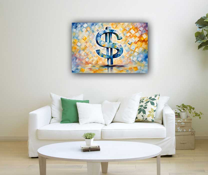 A painting of a dollar sign placed in the West direction serves as a strong symbol of financial prosperity and abundance. The dollar sign universally represents money and wealth, making it a powerful visual cue for attracting and enhancing financial gains.