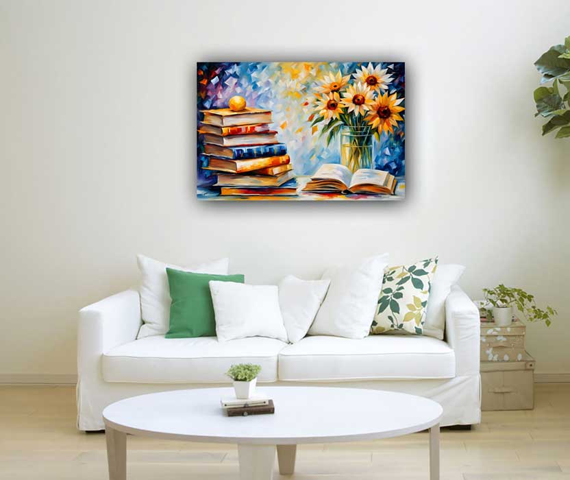 A painting of books with a flower vase, ideal for the West-South-West (WSW) direction, symbolizes education and creativity, enhancing focus and intellectual growth in this sector. Explore beautiful collection of Learning Symbols Click Here