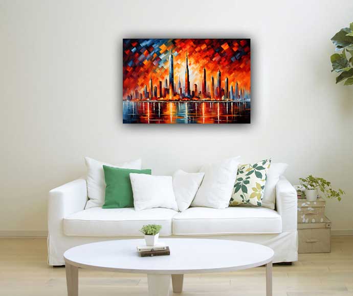 Enhance fame and recognition with our abstract skyline painting for the South Direction. Featuring vibrant red and orange hues, this artwork boosts passion and enthusiasm, aligning with Vastu and Feng Shui principles for success. Perfect for modern spaces seeking dynamic energy and visibility. Explore beautiful collection of Abstract Click Here