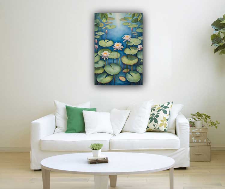 In Vastu, water lily paintings symbolize purity, serenity, and spiritual growth, representing the water element. They promote emotional healing, calmness, and mental clarity. Ideal for placement in the North, water lilies enhance peace, prosperity, and success in both home and office spaces.