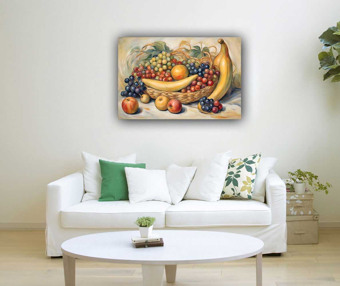 This vibrant and captivating painting showcases a bountiful basket overflowing with a colorful assortment of fruits, each symbolizing prosperity and abundance. The meticulous details of the fruits, from the glossy skin of the grapes to the textured rind of the citrus, evoke a sense of realism and luxury. The composition is carefully arranged, with the fruits cascading over the edges of the basket, creating a dynamic and inviting image. This artwork is a beautiful representation of wealth and prosperity, making it a perfect addition to any home or office.