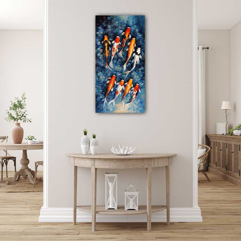 In Feng Shui, a Koi Fish painting symbolizes wealth, success, and the power to overcome obstacles in life, career, and business. Known for its resilience, the Koi Fish represents strength and determination. Placing it in the North boosts career opportunities, while in the South-East, it enhances financial success. This painting brings prosperity, personal growth, and harmony to any space.