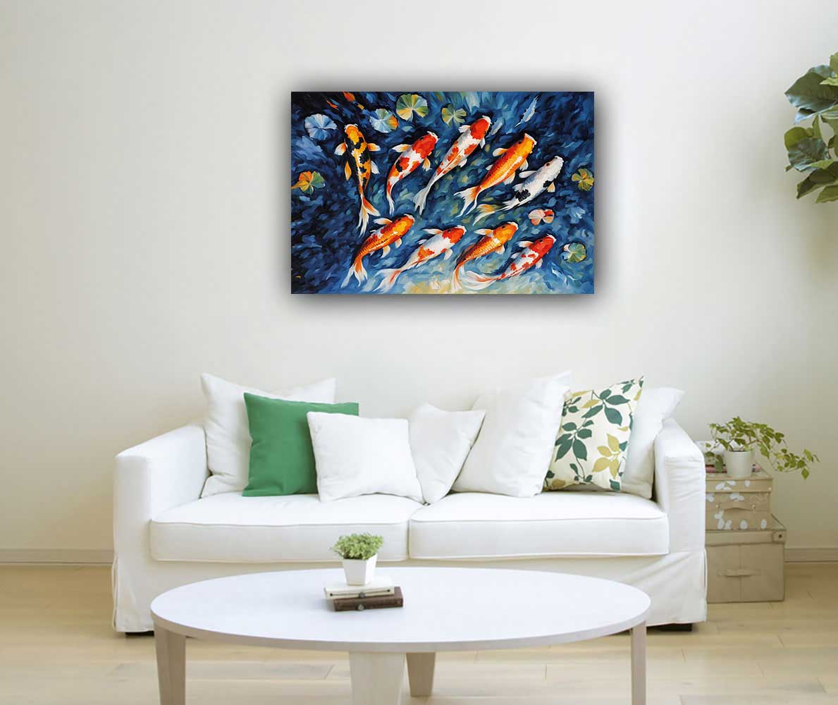 In Feng Shui, a Koi Fish painting symbolizes wealth, success, and the power to overcome obstacles in life, career, and business. Known for its resilience, the Koi Fish represents strength and determination. Placing it in the North boosts career opportunities, while in the South-East, it enhances financial success. This painting brings prosperity, personal growth, and harmony to any space.